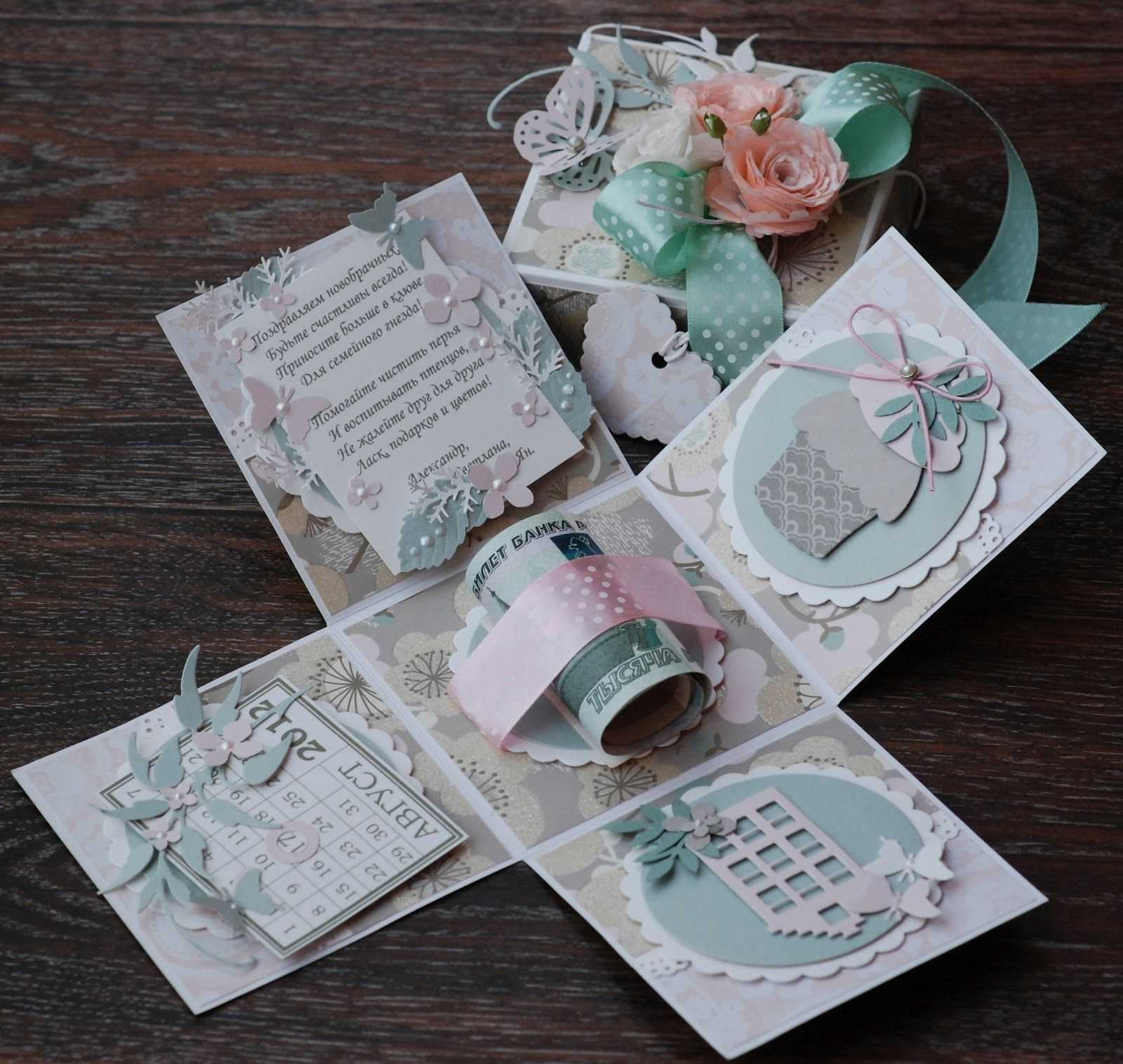 Простой и привычный вариант — конверт, но его можно сделать запоминающимся. Во-первых, можно написать искреннее пожелание на внутренней или внешней стороне, чтобы молодые понимали, от кого получили презент. Во-вторых, можно сделать упаковку своими руками. Кроме сложенного листа могут понадобиться вырезки из журналов, которыми можно обклеить поверхность.