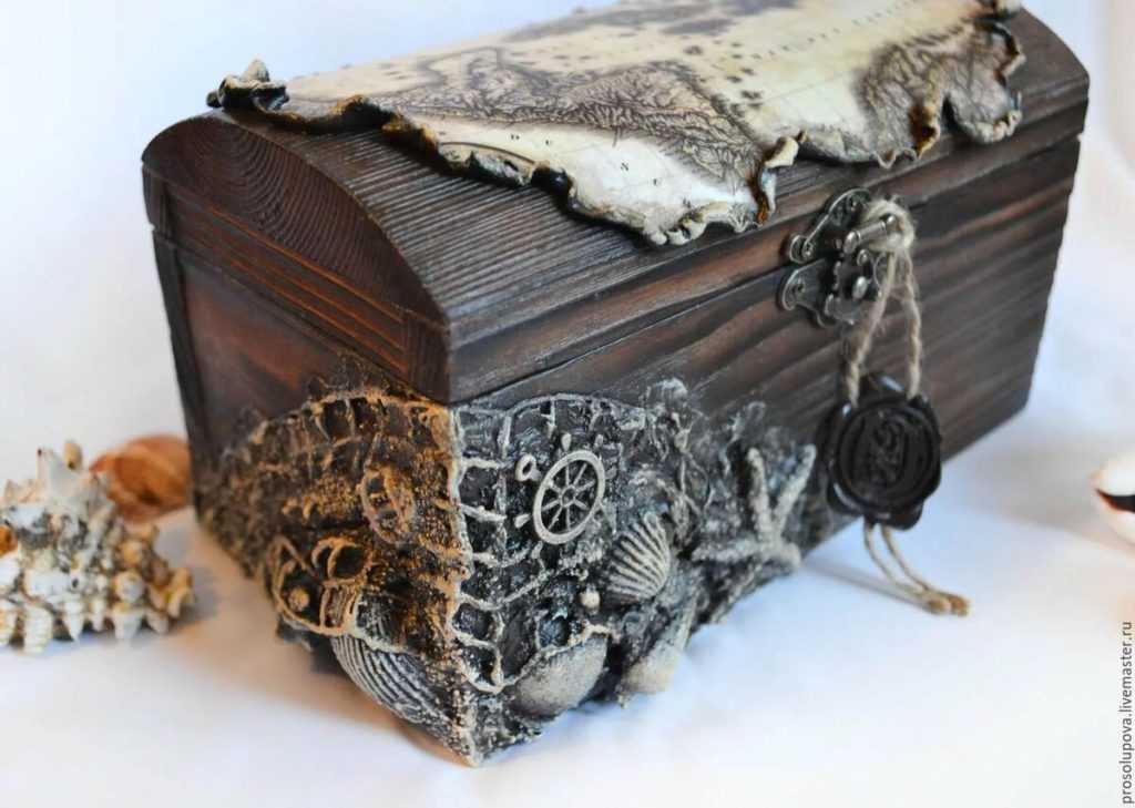 Можно обойтись без пиратской тематики – просто преподнести старую шкатулку. Для этого можно взять новую и придать ей старый вид, путем затирания новой поверхности и созданием искусственной патины. Получается очень необычно и интересно.