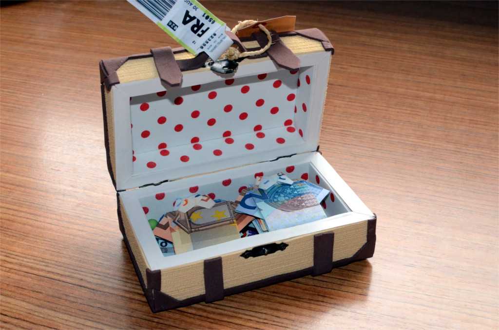 Разменянные купюры можно закатать в банку, а саму банку оригинально украсить и подписать. Также можно сделать сундучок для сокровищ, декорировать его, и туда насыпать купюры и монеты, можно несколько украшений. Будет необычно!