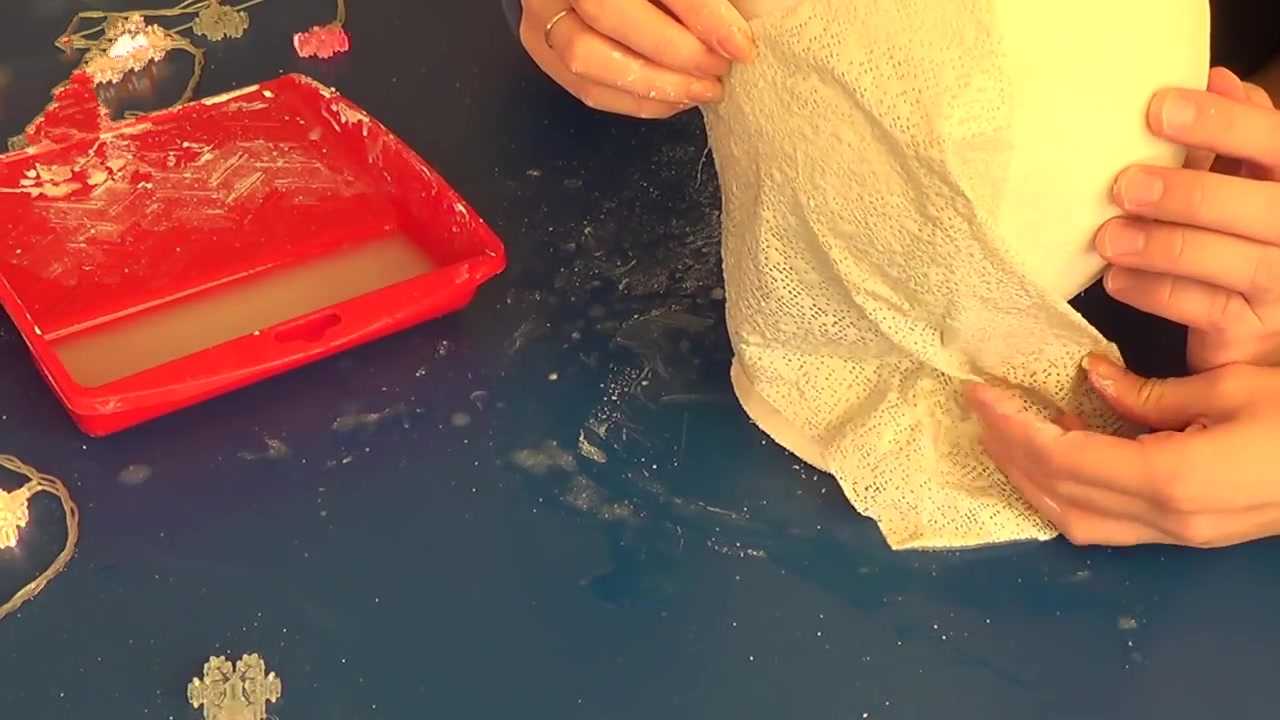 - Обматывают поверхность гипсовыми бинтами (или обычными бинтами либо полосками ткани, пропитанными гипсовым раствором густоты сметаны).