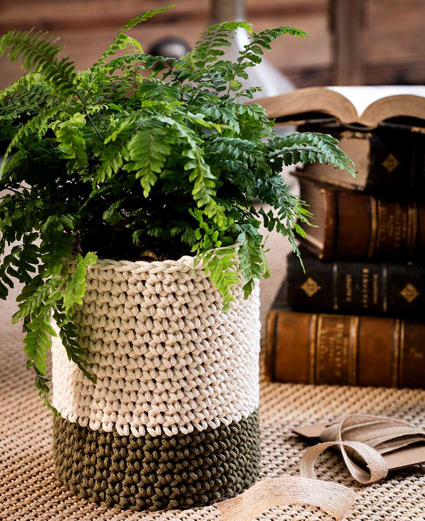 Как украсить цветочный горшок при помощи текстиля? Для этого можно использовать кружева, лоскутки тканей, нити, шнурки, ленточки. Элементы фиксируются клеем ПВА, создавая оригинальные композиции. Таким же образом приклеиваются фрагменты мешковины. Оригинально смотрится сочетание двух вариантов текстиля. Композиция может быть дополнена бисером, бусинками и тесьмой. Воспользовавшись техникой вязания крючком или спицами, можно создать симпатичные футлярчики для вазонов, что привнесет в атмосферу уют и комфорт.