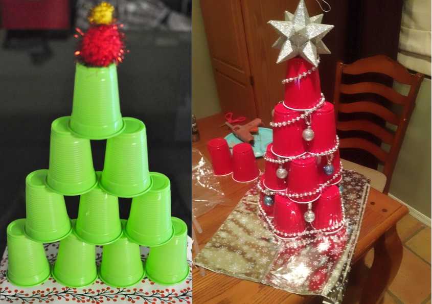 Кроме того, отдельно стоит рассказать о различных комбинированных изделиях из пластиковых стаканчиков. Так, например, если соединить стаканчики и пластиковые бутылки, то можно получить достаточно сложные конструкции — ёлку или денежное дерево. При этом некоторые подобные поделки могут иметь подвижные части. В результате ребёнок может получить полноценную игрушку, а взрослые — оригинальное украшение на стол.