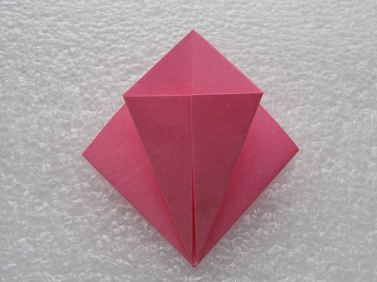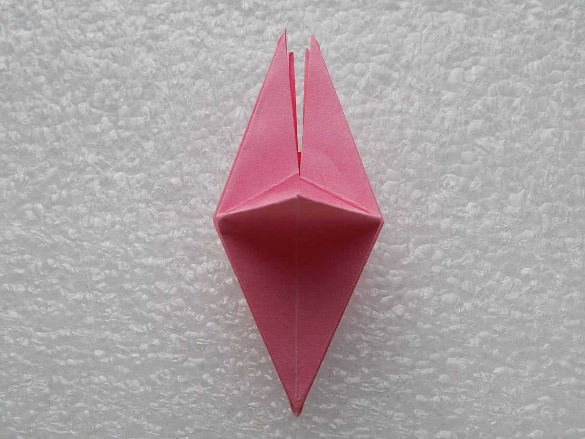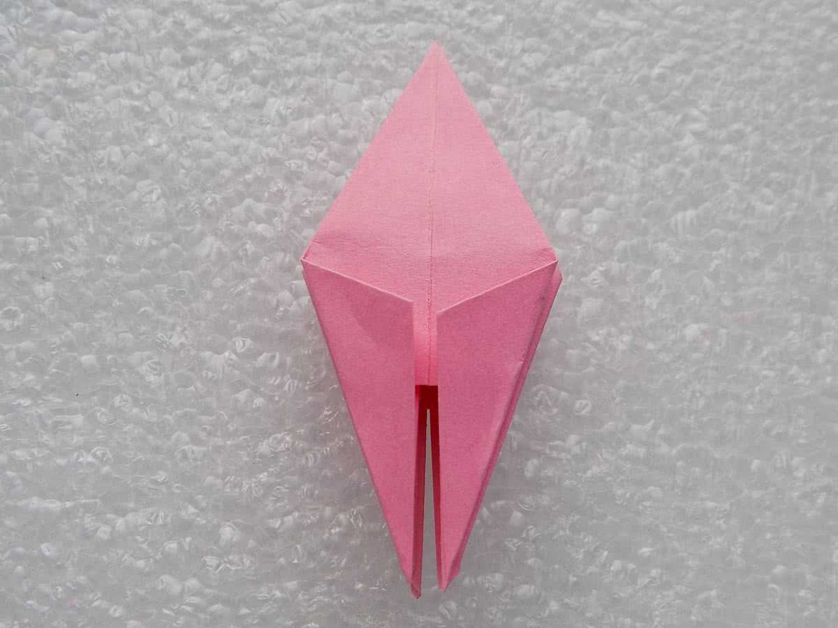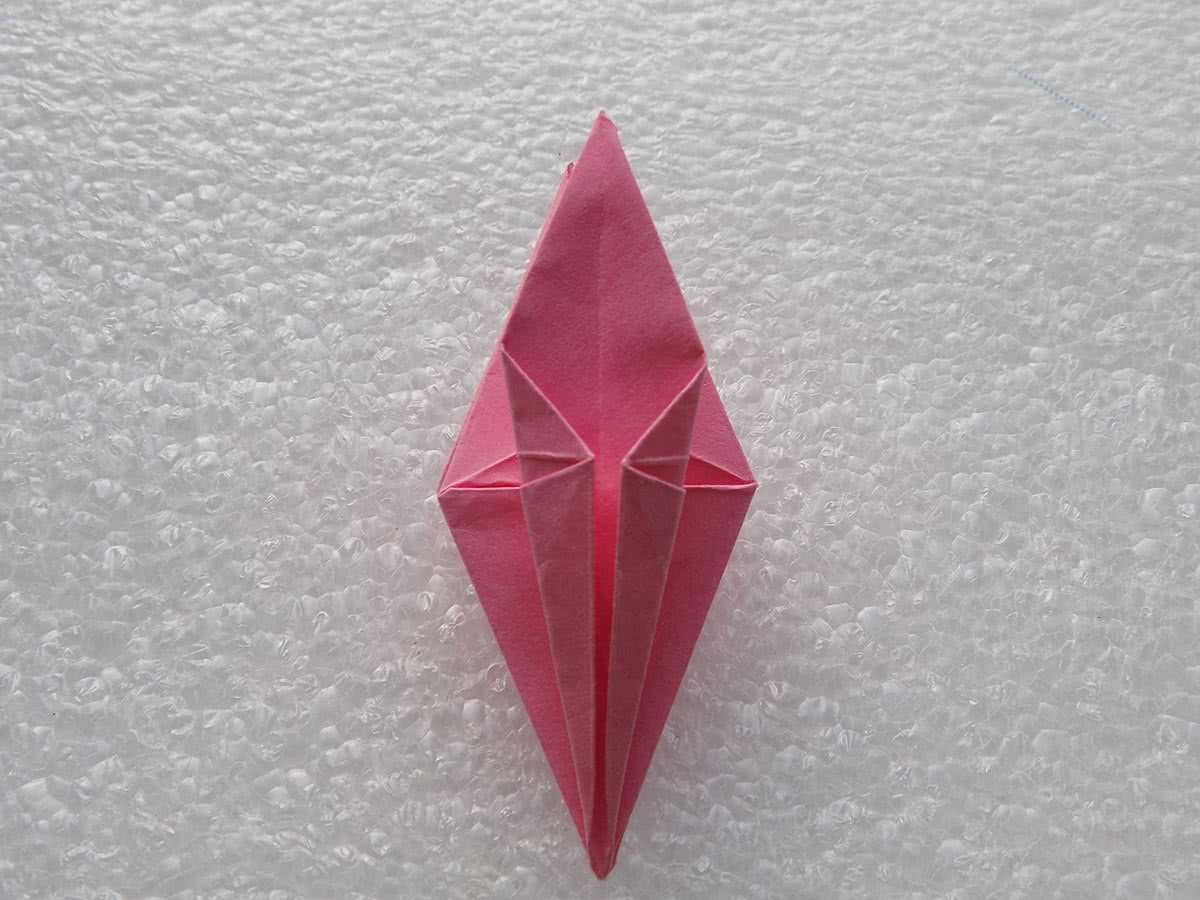 Расправить и отогнуть среднюю часть вниз и сделать новый сгиб треугольником.