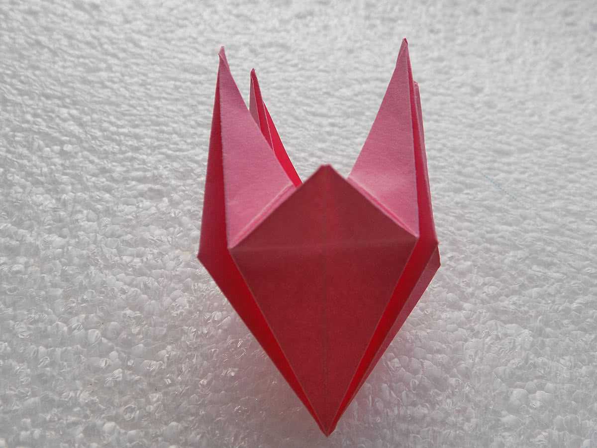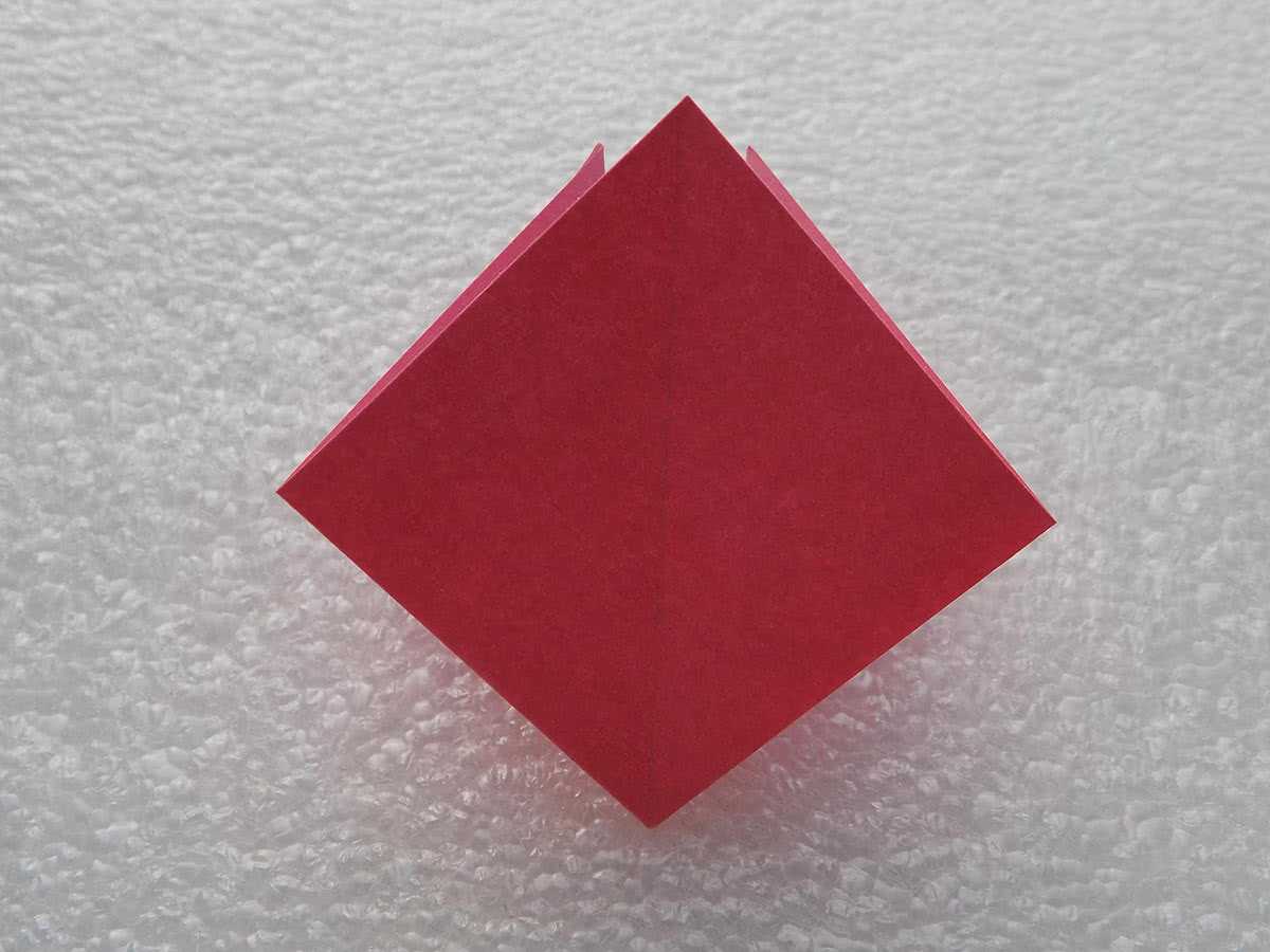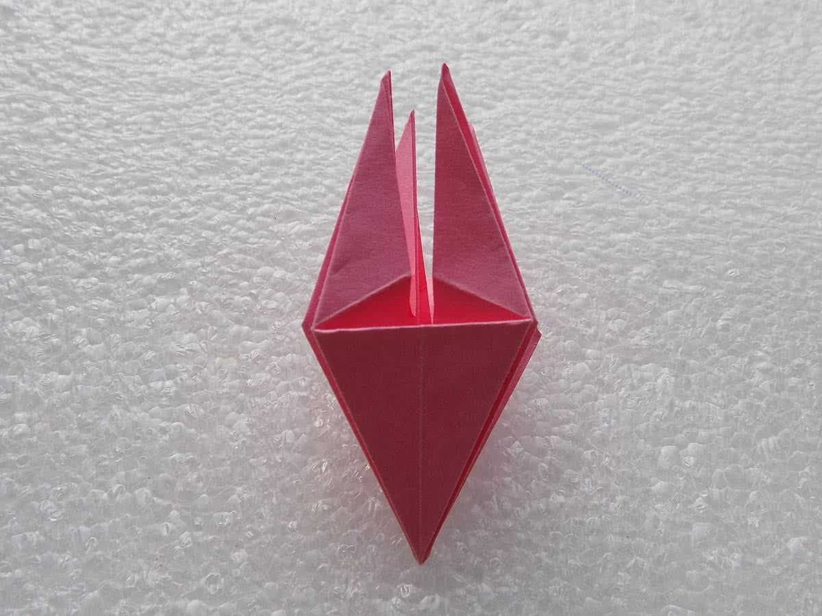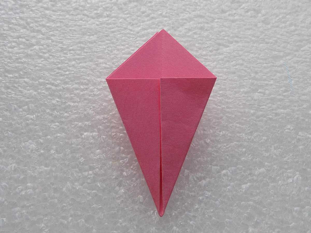 Расправить и отогнуть среднюю часть вниз и сделать новый сгиб треугольником.