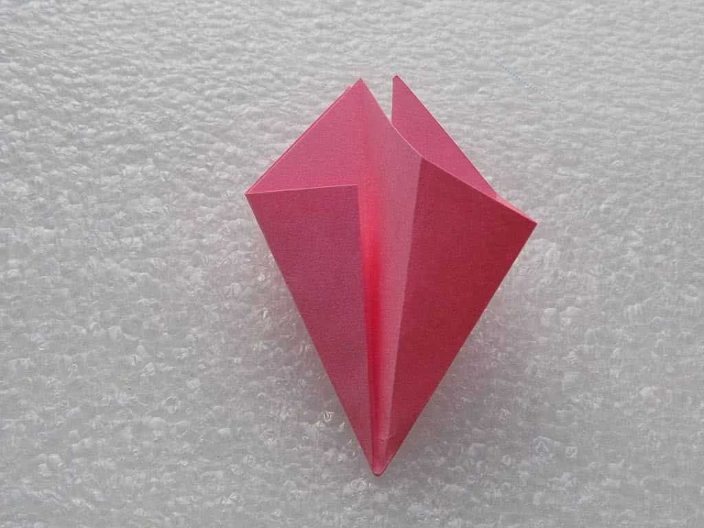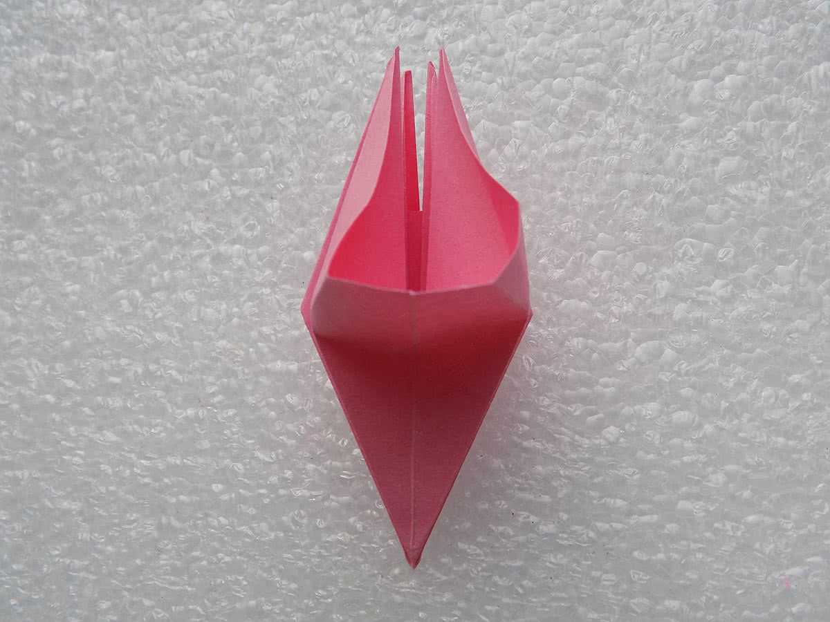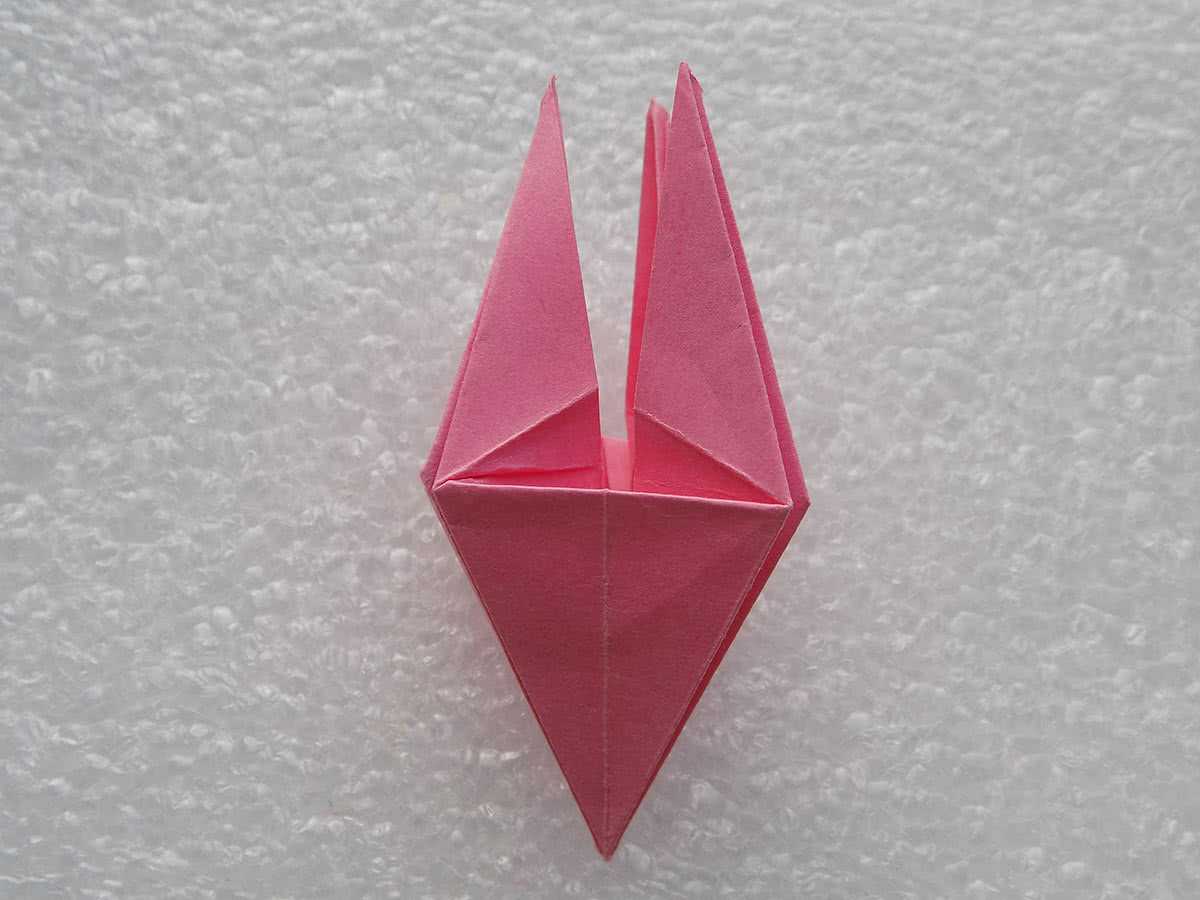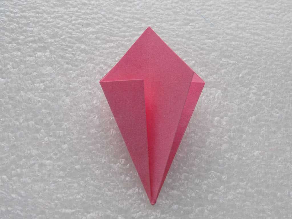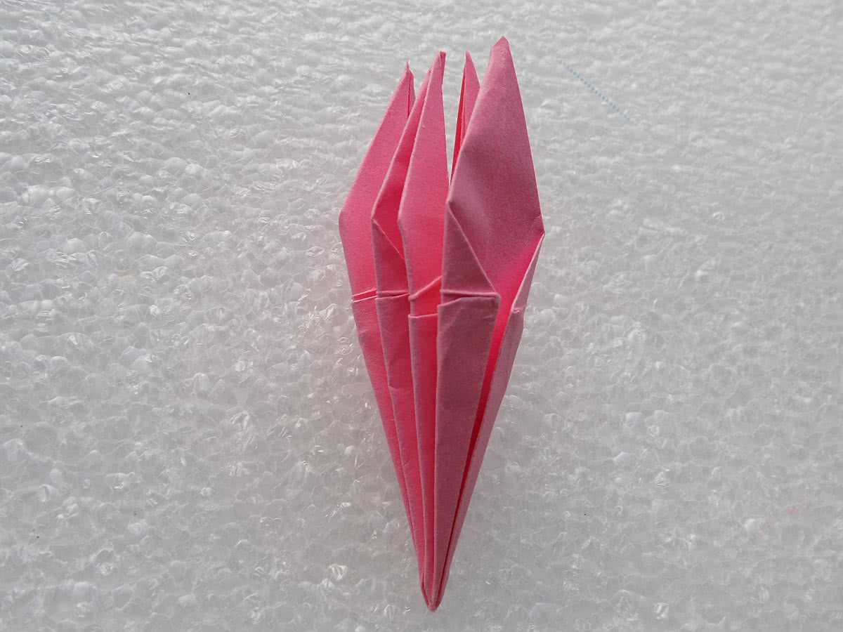 Расправить и отогнуть среднюю часть вниз и сделать новый сгиб треугольником.