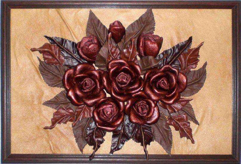 Изделия из кожи смотрятся стильно и необычно. Работать с натуральной кожей очень приятно, хоть и требуется определенная сноровка. Мастера, создают целые картины, натягивая и выкрашивая кожу в нужный цвет. Можно сделать объемные цветы или другие предметы, фантазия безгранична. Материал, можно купить в магазинах ткани, или распороть ненужный сапог.
