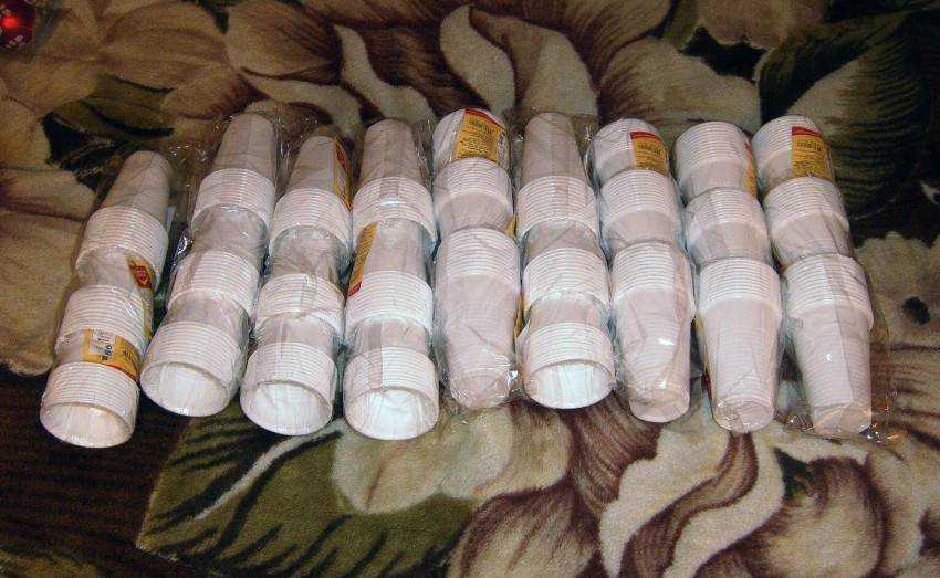 - Пластиковые стаканчики белого цвета – 3 упаковки по 100 шт;