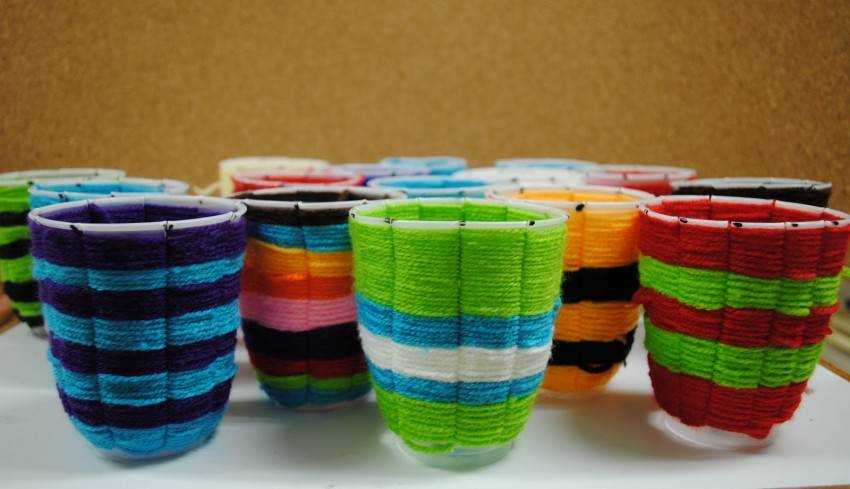 Выбирать стаканчики следует в тех оттенках, которые распространены в вашей комнате, поскольку именно они будут являться наиболее значимой частью. Необходимо проделать в них дырки, но не слишком большие.