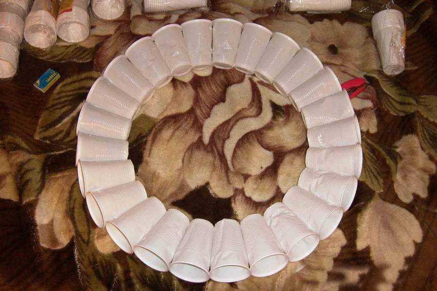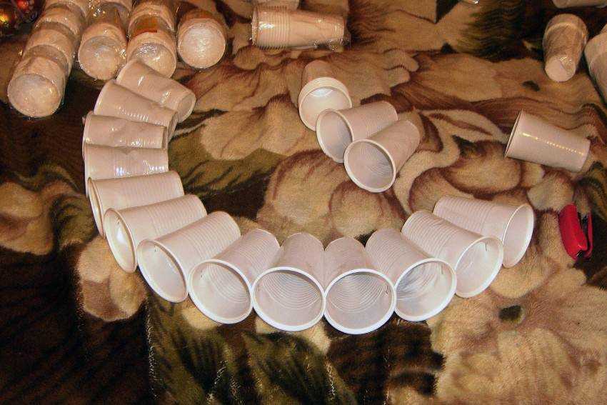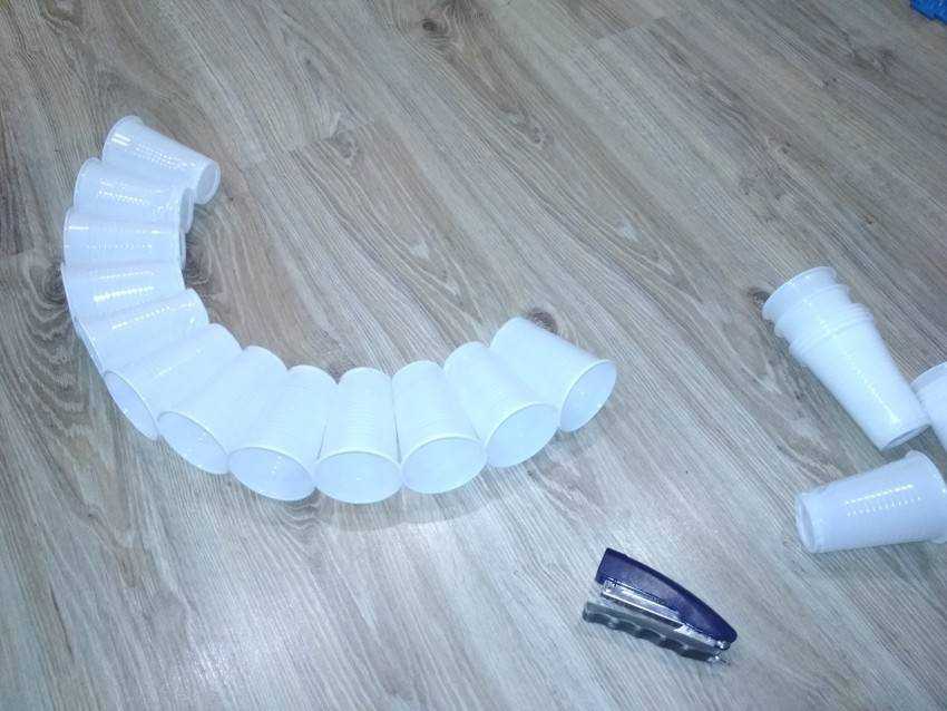 Для осуществления желаемой поделки необходимо сформировать 2 шара из пластиковых стаканчиков. Для этого выкладываем 30 стаканов в ряд и скрепляем каждый степлером, по такому же принципу готовим и другой ряд.