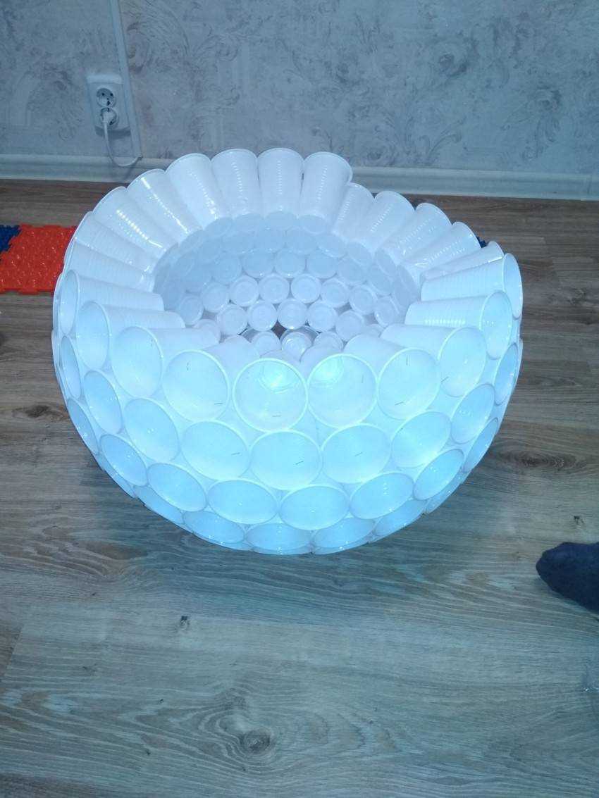 Кстати, не только пластиковые стаканчики могут пойти в ход. Используйте также и пластмассовые бутылки из-под воды, прозрачные или их можно выкрасить в белый цвет. Принцип сборки аналогичный, только лучше использовать не степлер, а серьезный клей.