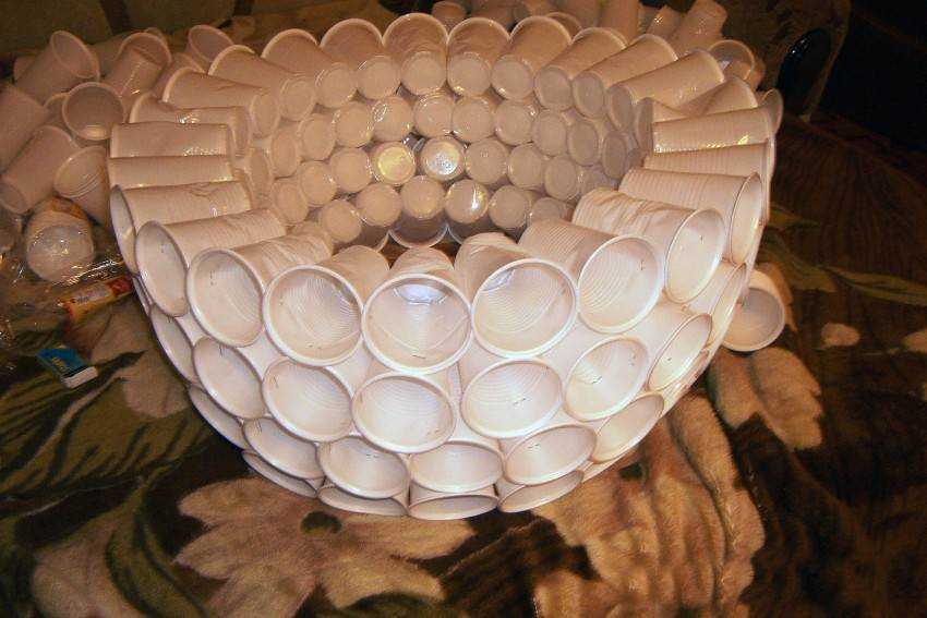 Для каждого последующего ряда потребуется меньше стаканчиков, так как фигура имеет конусовидную форму. Достаточно 7-8 шаров, чтобы полностью сделать первый нижний ком. При укладке стаканов нужно следить, чтобы они немного уходили внутрь шара, формируя полусферу. Заготовка остается открытой, чтобы установить на нее следующий шар.