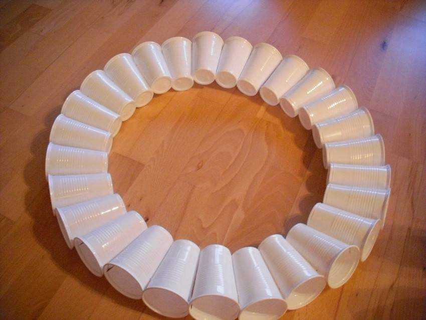 Кроме того, такая поделка может стать неплохим украшением стены или двери в школьный класс. Для этого не нужно делать полный круг из стаканов, а оставить полукруг, чтобы изделие было легче крепить к плоской поверхности.