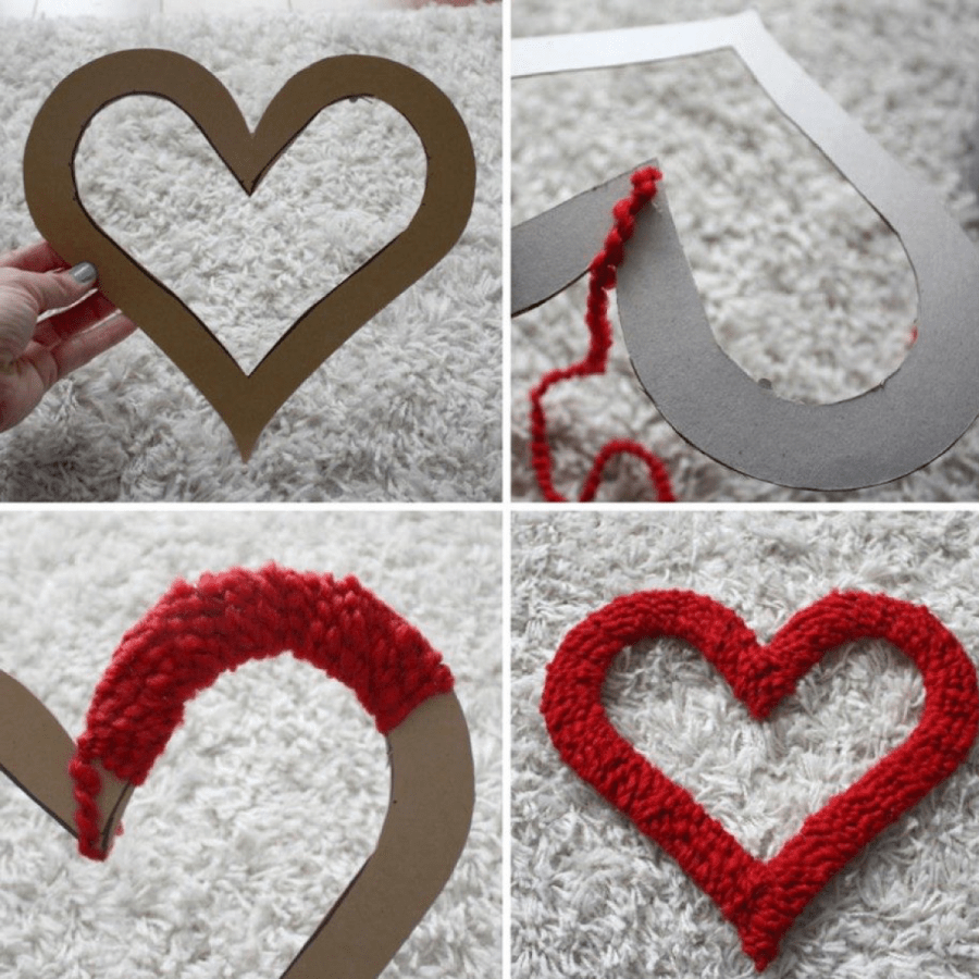 нужно сделать шаблон в виде сердца, например из картона, а затем густо-густо обмотать его ниткой. Можно взять нитки разных цветов, но подходящих друг к другу по цветовой гамме