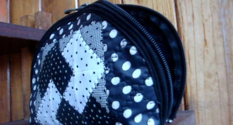 Небольшая круглая косметичка сшита без швейной машинки, лоскуты сшиваются вручную потайным швом.