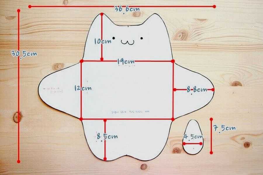 Выкройка косметички в виде кота с примерными размерами, которые можно менять. Как вариант, косметичка шьется из цельного куска ткани, но в идеале предполагается лоскутное шитье, когда лоскуты сначала сшиваются в полотно определенной формы.