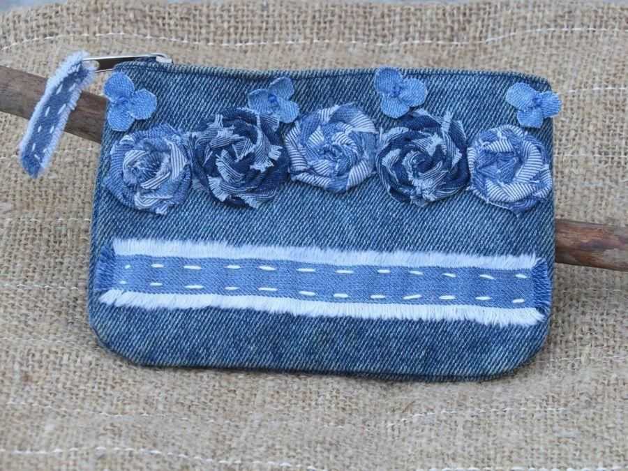 Хорошей идеей будет украсить косметичку различными элементами декора или нашивок. К примеру, можно скрутить такие красивые розочки из джинсы.