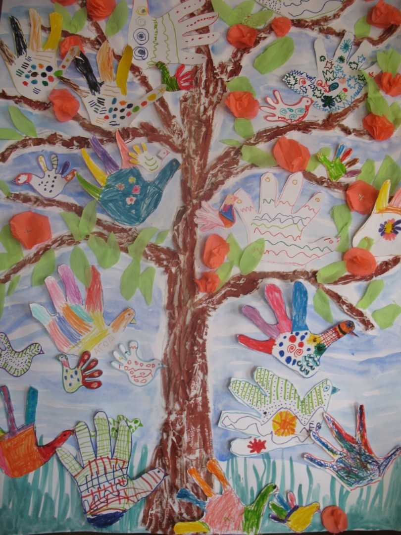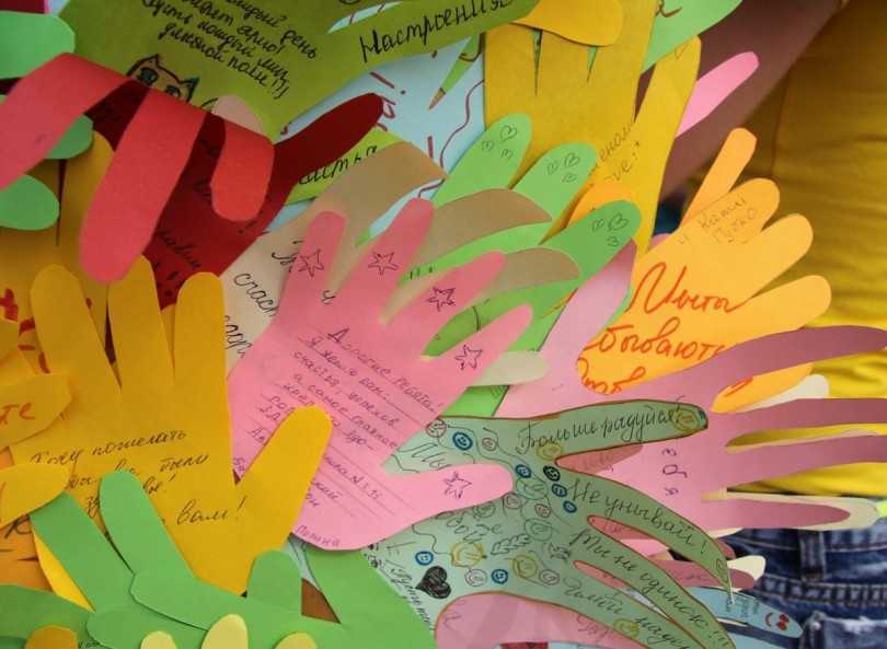 - Вначале готовим отпечаток ладони каждого ребенка в группе или в классе. Отпечатки должны быть разных цветов – в этом случае открытка получится гораздо красивее.