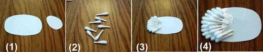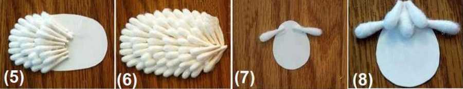 Из листа плотного картона вырежьте овал и круг (тело и голова будущей овечки). Теперь от ушных палочек отрежьте только те участки, где на них есть вата. Постепенно накладывая друг на друга, пушистые части ватных палочек приклеивайте к телу будущей овечки (см. фото).