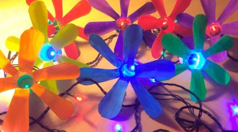Еще вариант — нарезать от горлышка на полоски равной ширины — 1-1,5 см, отогнуть их (прогрев немного у основания). Средний венчик сделать из боковой части молочной бутылки или покрасить прозрачный пластик акриловой краской.