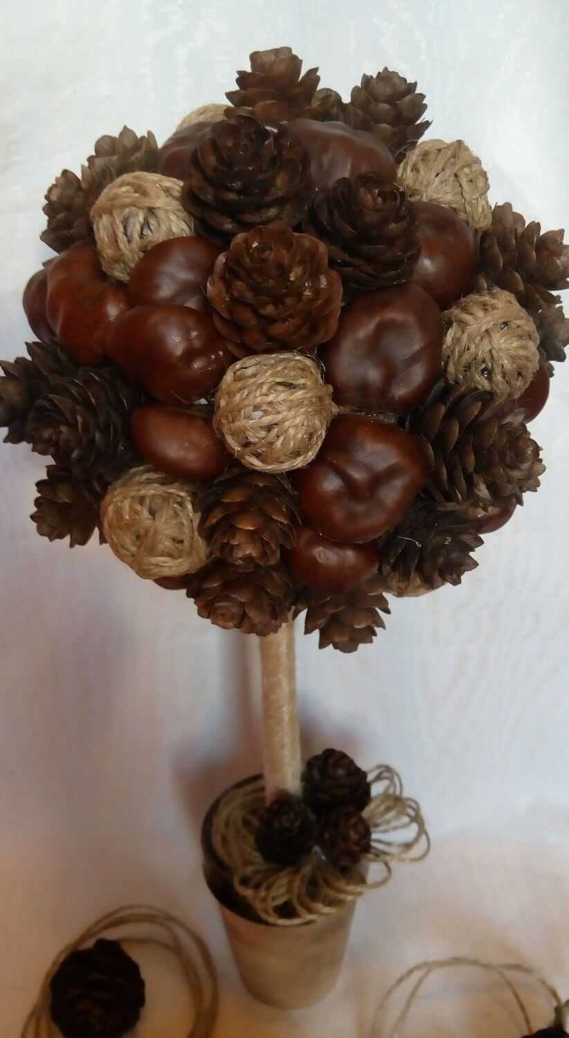 - Когда база будет готова, можно обклеить верх топиария каштанами, украсить рябиной, осенними листьями, сухоцветами, бантиками, бусинами.