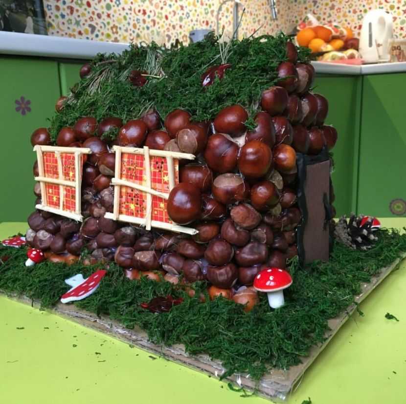 Домики – пожалуй самые интересные работы, сделанные из подручных материалов. В нашем случае – он получится сказочным из-за придания поверхности вида сказочной избушки. Возьмите картон и соорудите из него куб. Предварительно вырежьте место где будет оконце и дверь. Далее при помощи пластилина обклейте поверхность дома плодами. Интересно получится, если окна и двери сделать из пластилина ярких цветов. Картон предварительно покрасьте коричневой краской, чтобы расстояния между каштанами не бросались в глаза. Крышу можно сделать из зубочисток или спичек, приклеив их к бумаге.