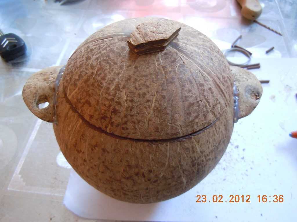 Чашка, горшочек или кувшин с крышкой — точно так же распиливаем кокосовый орех поперёк, крепим донце, для чашки делаем ручку из дерева или полукольца от меньшего по размеру кокоса. Крышку для кувшина делаем так: или ею будет срезанная «макушка» ореха — простой вариант, или берём часть от другого кокоса, делаем посередине отверстие, через которое будем наполнять сосуд, переворачиваем «лодочкой». Крепим «лодочку» на горло кувшина, с внешней стороны маскируем место стыка веревкой, шнуром, полоской кожи.