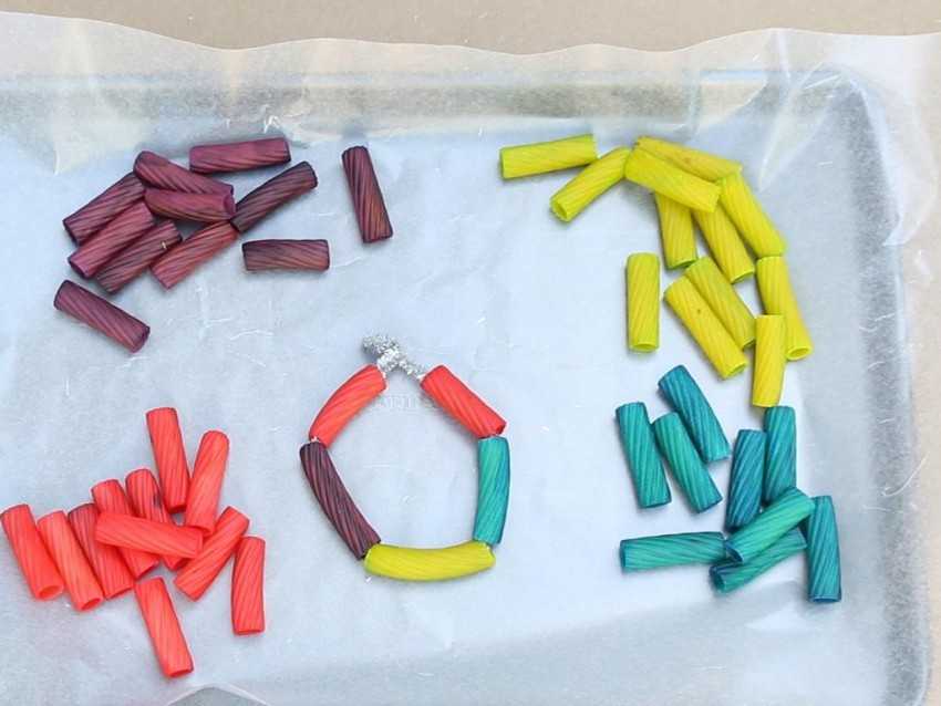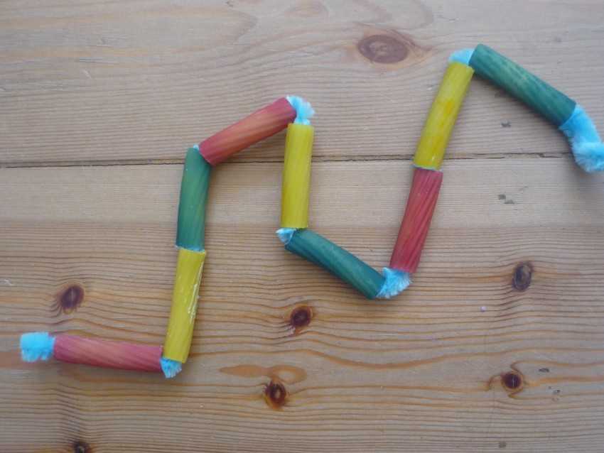 Таким образом, можно окрасить макароны для изготовления поделки детям как на предварительном этапе (до сбора изделия), так и на заключительном (после общей сборки композиции).
