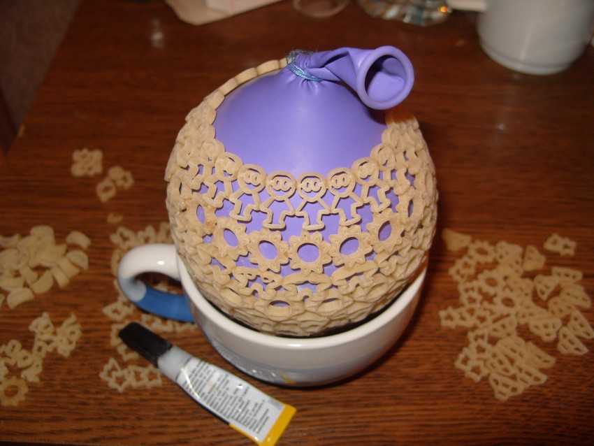 Для изготовления чайника вам необходим воздушный шарик. Надуйте его до желаемого размера, а затем оклейте макаронами (предпочтительно той же формы, что и у подноса), стараясь располагать их близко друг к другу. Сверху оставьте небольшой круг не оклеенным.