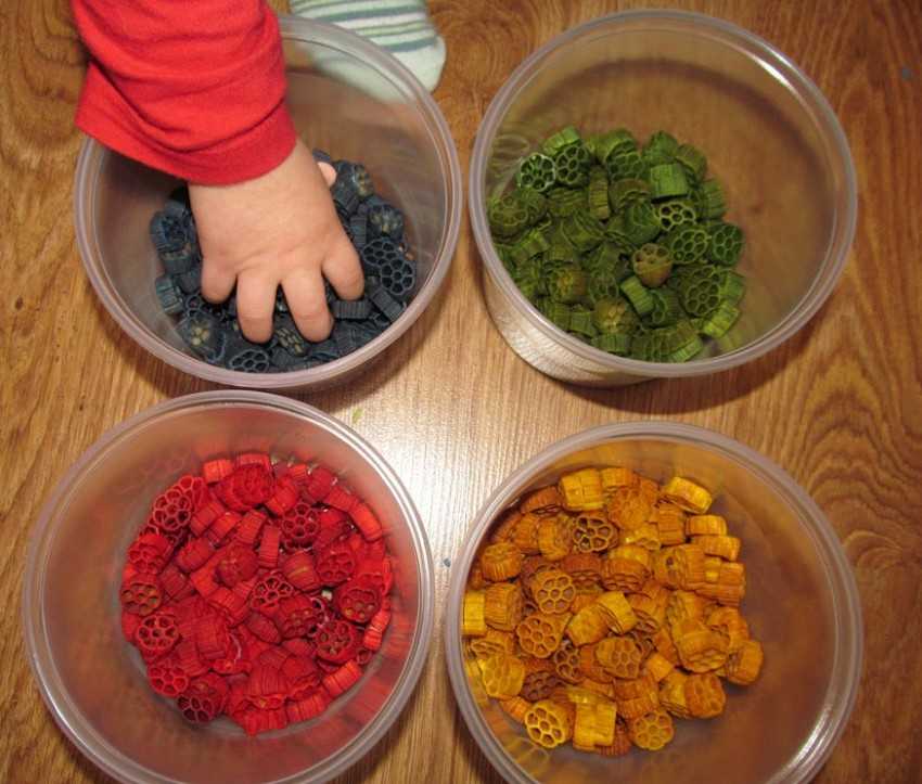 Перед тем как заняться изготовлением поделок в домашних условиях, необходимо подготовить макаронные изделия: разделить их на части и покрасить каждую «кучку» в разный цвет. Маленьким детям лучше давать покрашенную крупу. Школьники могут выполнить процесс окрашивания вместе с взрослыми.