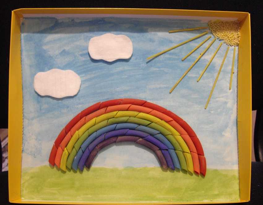 - Гуашь. Этот способ считается не очень удачным, так как макароны окрашиваются неравномерно, а при создании поделки — пачкают руки и картон. Не меньше трудностей возникает и при работе с акварелью, растворенной в воде.