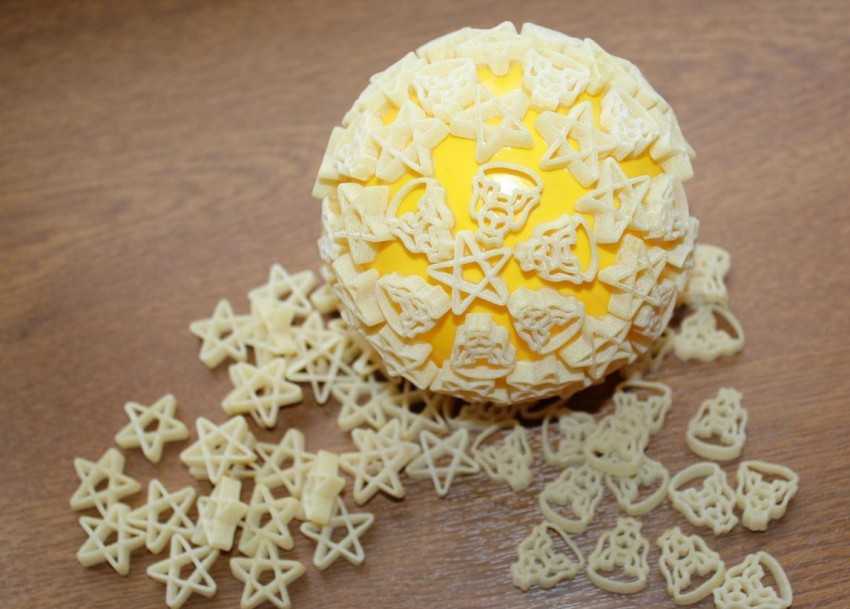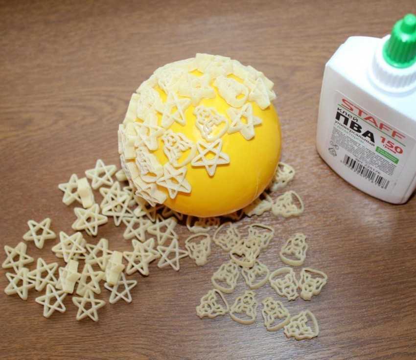 Затем при помощи клеевого пистолета приступайте к декорированию шарика макаронами. Делайте это аккуратно, оставляйте между макаронами минимум свободного места. Если промежутки всё же остаются и пенопласт виден, прикройте их при помощи макарон меньшего размера.
