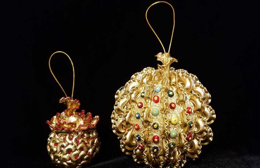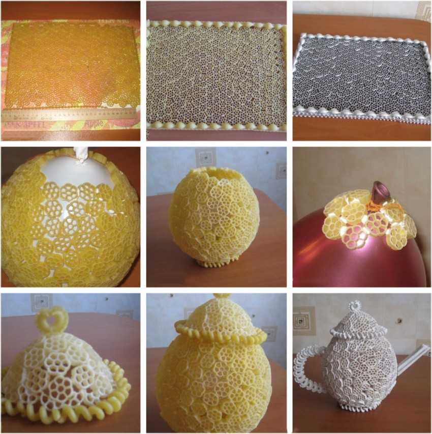 После того как клей высохнет, проткните шарик иголкой и аккуратно извлеките. Аналогично, при помощи шарика, сделайте крышку. Когда она будет готова, украсьте её макаронами красивой формы. Вам останется сделать из макарон той же формы ручку и носик.