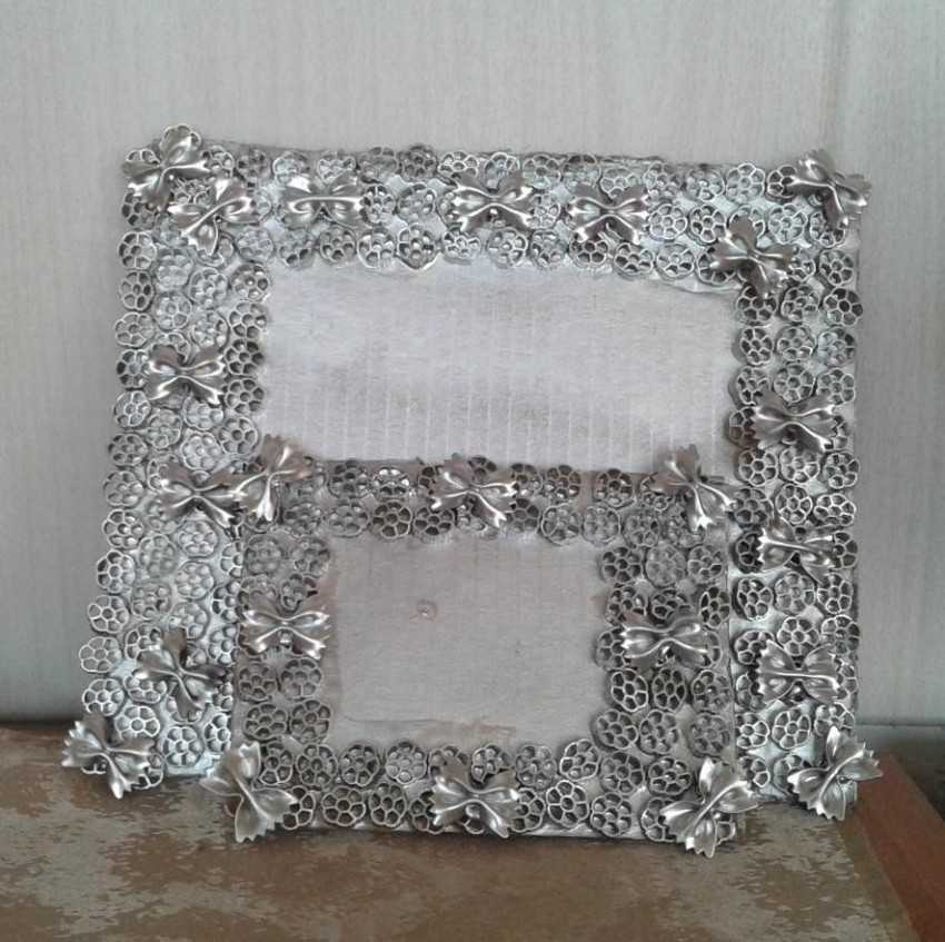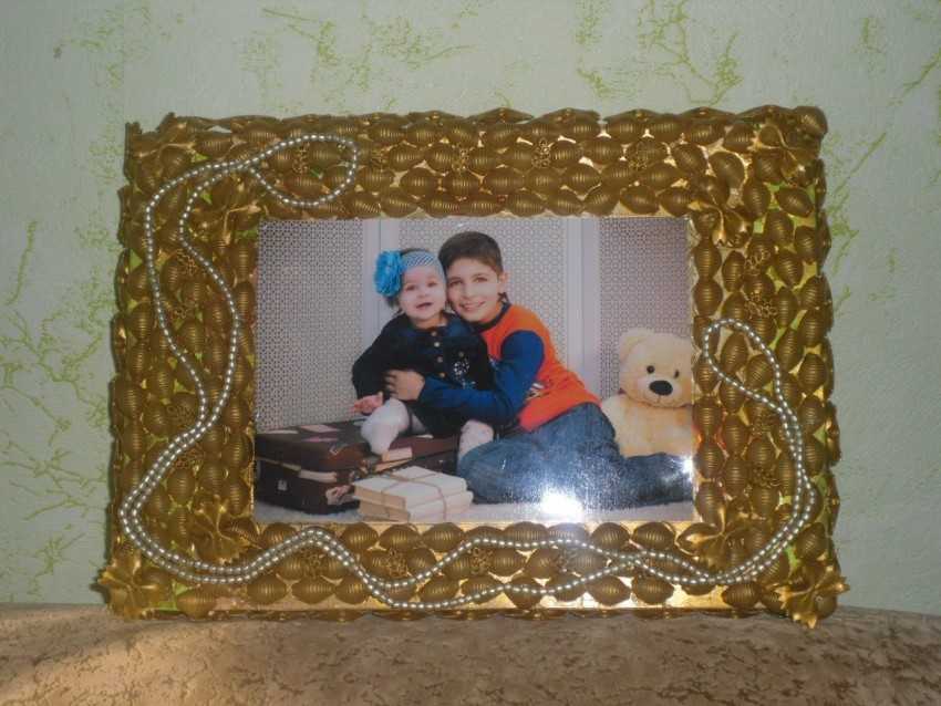 - После того, как картонная основа будет готова, нам нужно приступить к ее оформлению макаронными изделиями. Берем клей и, включив свое воображение, прикрепляем разнообразные фигурки так, чтобы не было видно никаких пробелов в работе. Можете ссылаться на наше фото или же создать что — то свое, более прекрасное.
