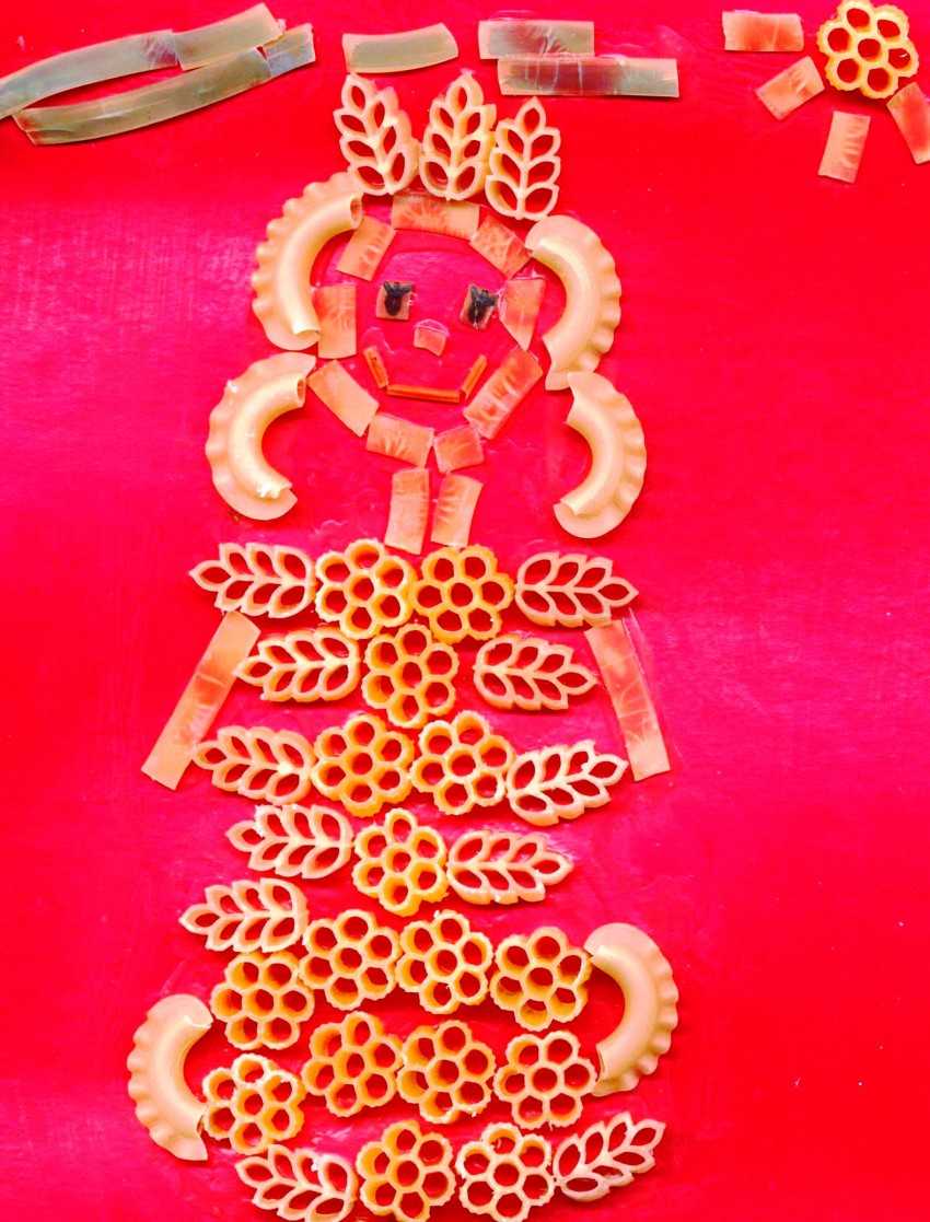 Самая простая техника – крепление мелких деталей с помощью клея ПВА. Задача ребенка – выбирать нужную форму элементов для аппликации, наносить клей кистью на фрагменты эскиза и наклеивать макароны на поделку.