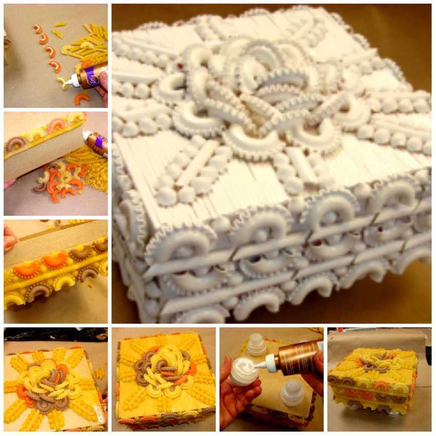 Теперь можете использовать декоративную шкатулку по личному усмотрению. Отдельные творения обклеивайте макаронами в различном порядке, проявляя всю имеющуюся фантазию.