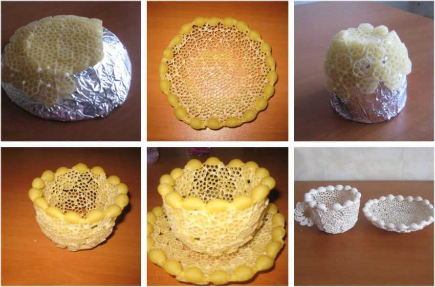 Для изготовления макаронного блюдечка возьмите обыкновенное блюдце и оберните его фольгой. Необходимо оклеить его макаронами. Как и в случае с подносом, прикройте неровные края блюдца фигурными макаронами. Точно так же сделайте и чашку. Все предметы сервиза окрасьте краской (возможно, потребуется нанести её в 2 слоя).