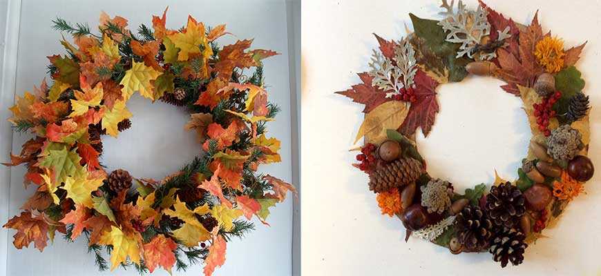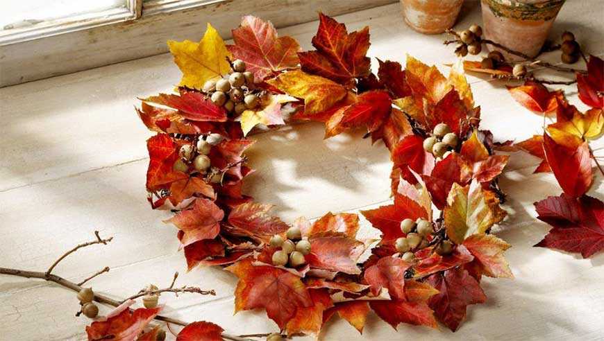 Из ярких осенних листьев можно сплести красивый венок для украшения окон, дверей, стен и пр. Венок, прикрепленный к входной двери, будет радовать не только вас, но и ваших гостей.