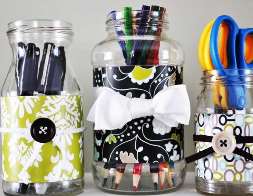Можно придумать массу способов украсить поверхность банки, чтобы получился красивый органайзер: