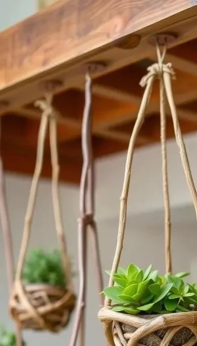 Подвесные кашпо из веток: Оригинальный способ украсить балкон или террасу – подвесные кашпо, сплетенные из веток. Они добавят природный шарм вашему интерьеру.