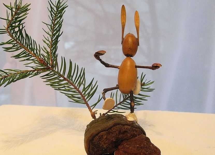 Красивыми и простыми в изготовлении получаются изделия из желудей и грецких орехов. Так как к твердой ореховой скорлупе довольно сложно что-либо прикреплять, то для соединения деталей между собой можно использовать пластилин или же крепить желуди, шляпки и половинки скорлупок на картонную основу клеем.