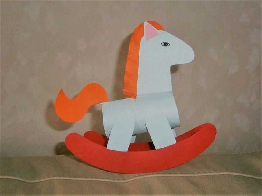 Такая версия лошадки качалки считается самой простой и интересной. Детям точно понравится её делать, так как в неё нет никаких сложностей. Достаточно свернуть «туловище» в трубу и склеить. Отдельно вырезать подставку, которая будет качаться.