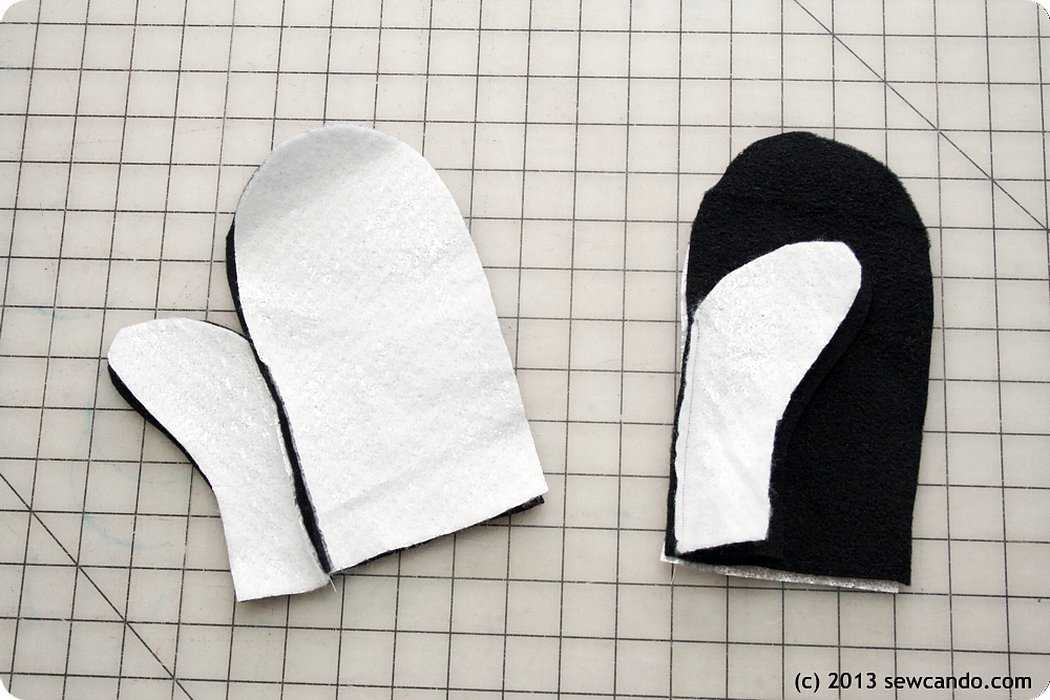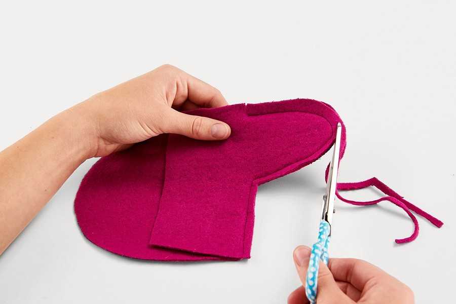 Стачать обе детали варежки на расстоянии 1 см и срезать припуски шва до ширины 5 мм. Варежки вывернуть.