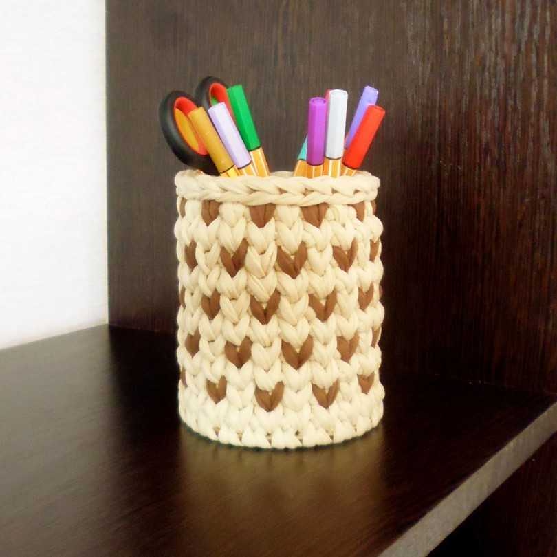 По мере заполнения всей наружной площади (кроме низа) нить обрезают, аккуратно запрятав ее конец. Такой дизайн прост и в то же время эффектен. В подобную вазу можно поставить живые цветы, ее можно украсить узлами из рабочего материала.