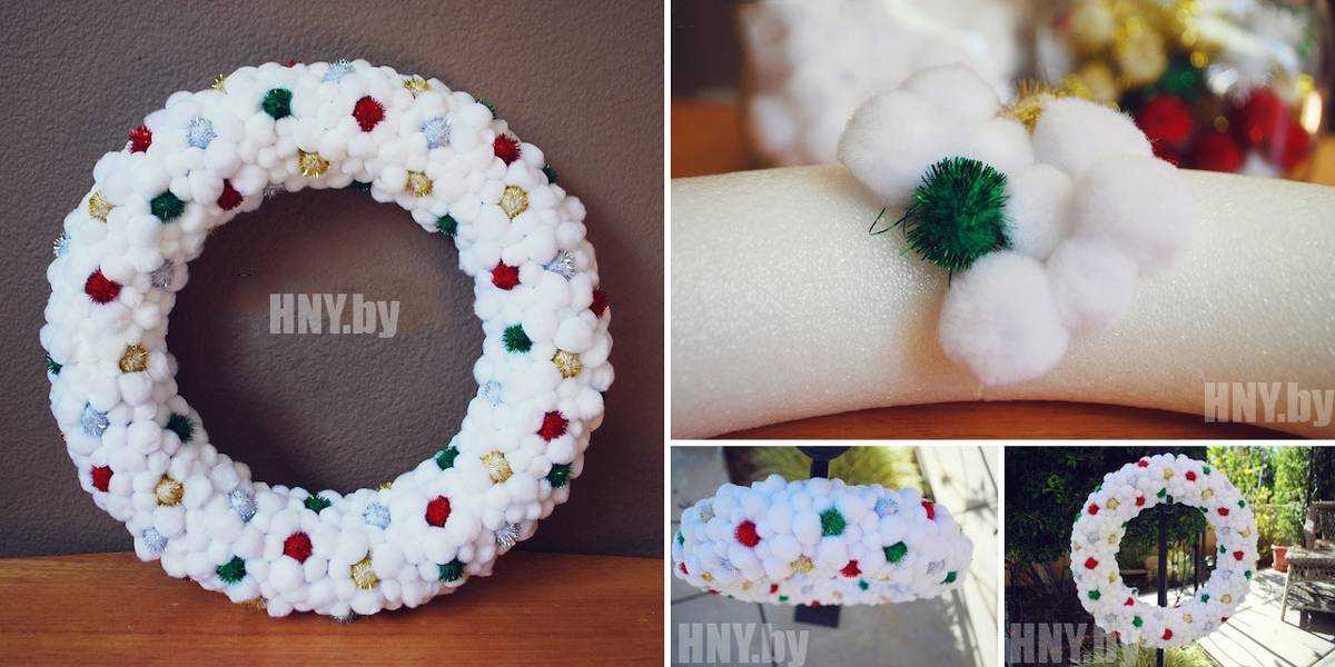 В качестве материала для новогодней поделки в школу можно использовать ватные шарики, приобрести которые можно в любом супермаркете. Для изготовления понадобится: основа для венка, ватные шарики, мини помпоны, клей.