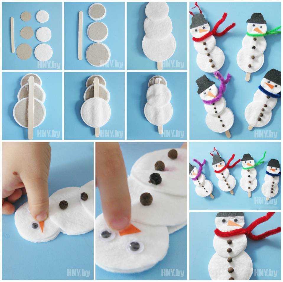 Если все предыдущие идеи Вас не впечатлили, предлагаем сделать поделку из ватных дисков. В этом мастер классе мы предлагаем сделать снеговиков своими руками. Вам понадобится: ватные диски, картон, клей, палочки от мороженого, фетр, элементы декора (глазки, пуговицы, бусины и пр.).