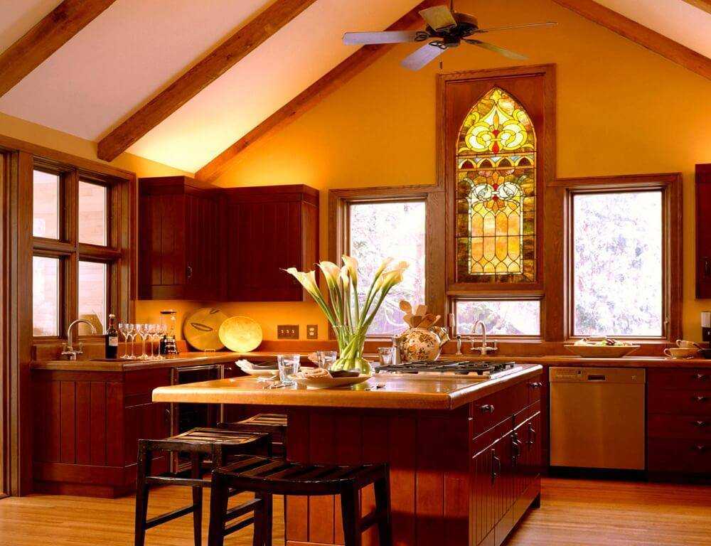 При оформлении дома, особенно когда это коттедж, который поддерживается в деревенском стиле, стоит заменить стекло в окне или входную дверь витражем, который придаст интерьеру неповторимую атмосферу.