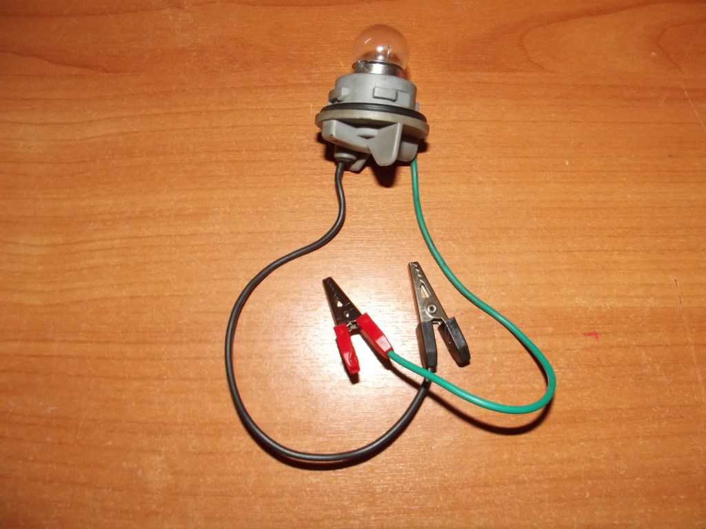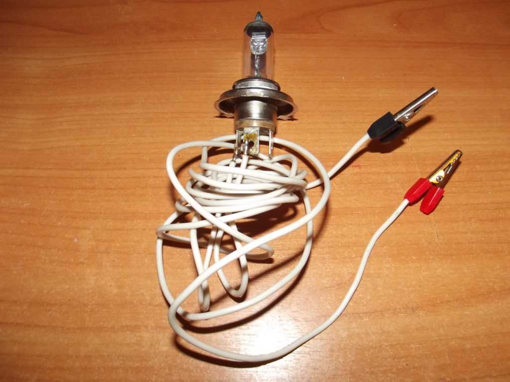 Теперь берем автомобильную лампочку-галогенку и тоже припаяем к ней два проводка с крокодилами. Я припаялся к клеммам на «ближний» свет.