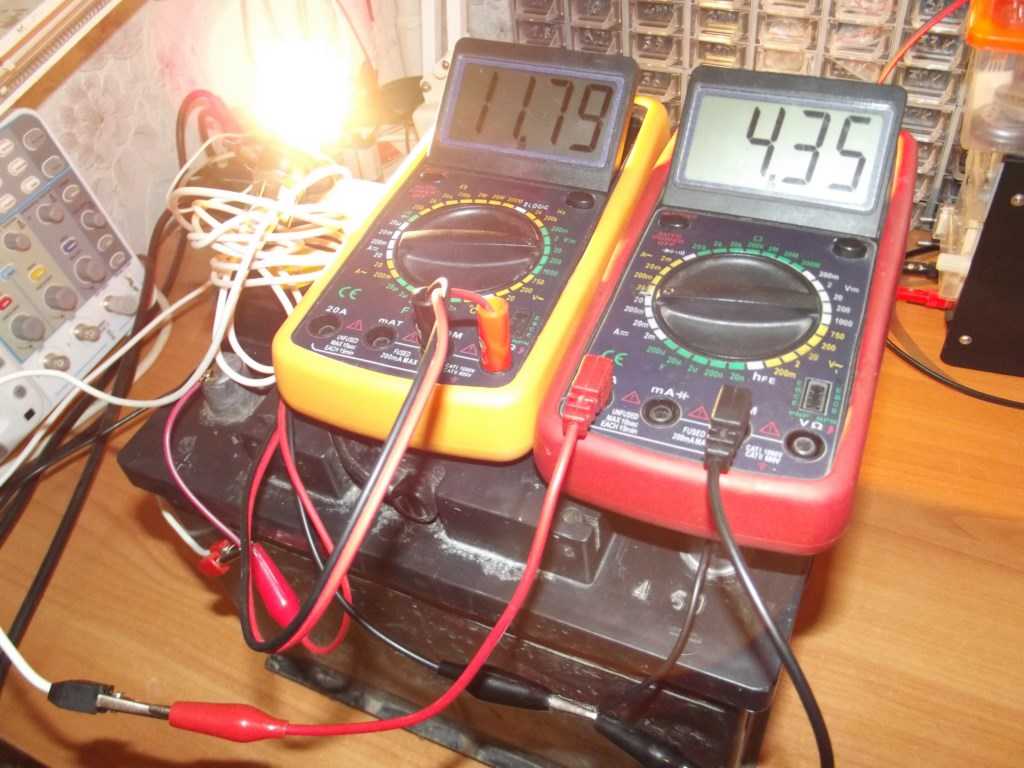 Как мы видим, наша лампа потребляет 4,35 Ампер. Напряжение просело до 11,79 Вольт.