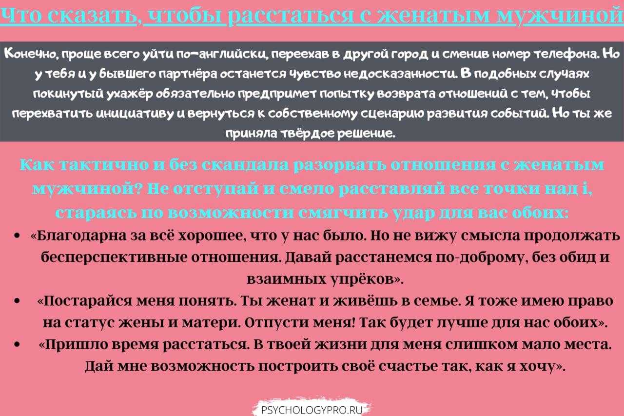 В память о былом давай разойдемся без взаимных обид и упреков». Как вариант, можно тактично объяснить: «Пойми! У тебя есть семья. Я же хочу быть женой и матерью. Хочу здоровых нормальных отношений и стабильности. Не удерживай меня! Для нас обоих пришло время двигаться дальше».
