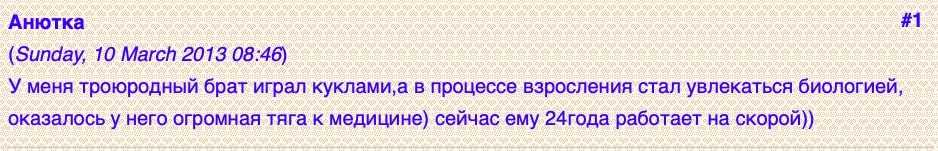 - «Я купила куклу племяннице в подарок, а сын захотел с ней играть. Я ему говорю: „В куклы играют только девочки, а ты мальчик“. Он запротестовал, истерика была ужасная. Мальчик и вдруг такой неподдельный интерес к куклам. С чего бы это? Как-то подозрительно, волнуюсь…»